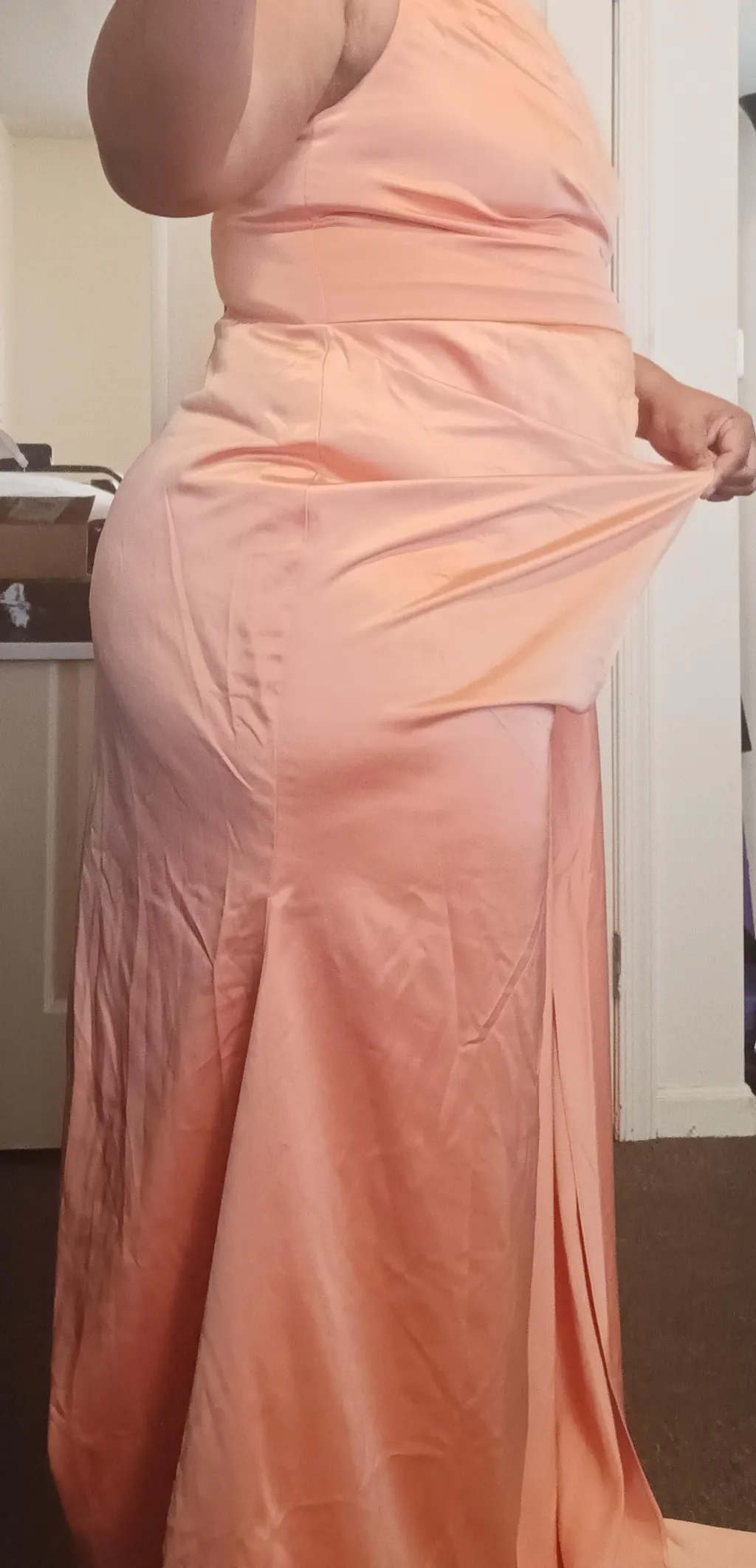 I went for a custom-made dress, threw in a slit for a little edge, and it surprisingly fits like a glove. But, you know, the slit turned out a bit higher than expected – slightly pushing the comfort zone. Still, it's got that tailored charm, quirks and all.