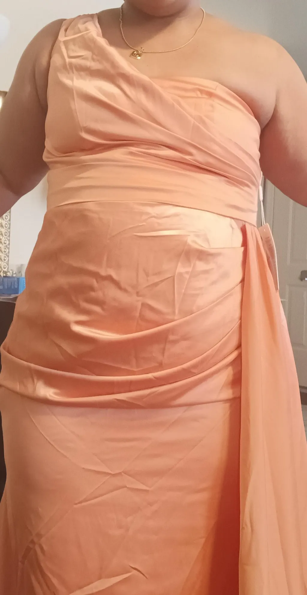 I am giving this dress 3 stars. Because for one, the draping of the dress is not how it is in the picture, I chose the custom size because I didn't want to have to deal with getting a dress size sending it back or whatever to exchange and stuff, I measured myself 3 times and gave a extra inch and a 1/2 For the top part , because it's easier to take in than it is to take out and the top part is so tight the Armscye to put your arm through for the shoulder, strap is extremely tight. And then when you get down to the waist, I gave them my measurements with a 1/2 inch difference, because once again it's easier to take in than it is to take out and when I say the dress is so loose at the bottom, and i'm a little confused because the lining of the dress is tight or like fitting in places, but the actual satin part of the dress is loose. the only thing that's right on this dress is the length but the mermaid tail. It's like a one size fit all pattern because it's like 6 or more inches longer than my dress. Also I know I measured myself correct, because I make clothes and dresses.I just didn't have that fabric that she requested.And I knew I wasn't gonna have time to make the dress myself, so I knew I measured myself correctly and gave them the correct measurements. So like , if you're not one of those big boob , small bust , small waist and curvy hips, this dresses is not for you.And i'm not the only one there are 7 other women on the bridesmaid team and all of their dresses are tight at the top. Whether you do custom sizes or not. It's like for the bust part.You need to give them like 2 and a 1/2 inches different and for the waist and hip part, you need to give them at least\nAn inch off
