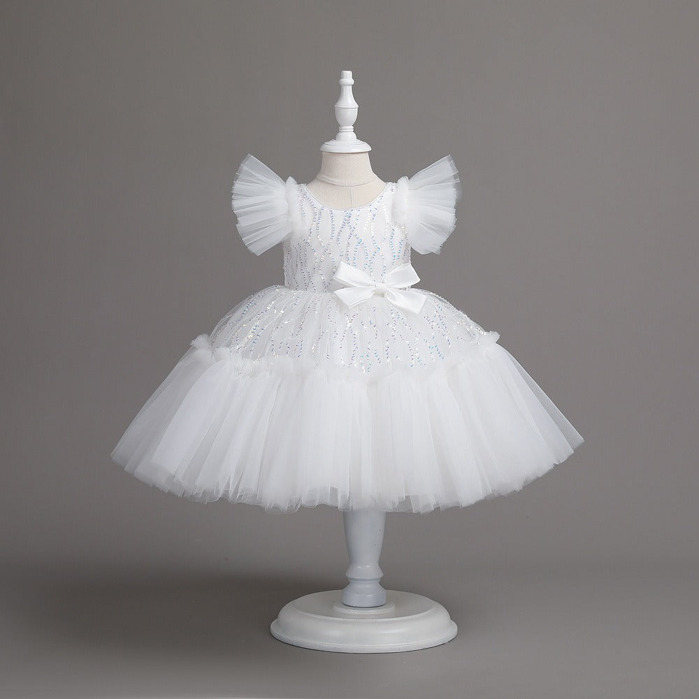 Flower Girls Dress Formal with Bow Sequin & Feathers A-line Tulle Princess Gown for Wedding