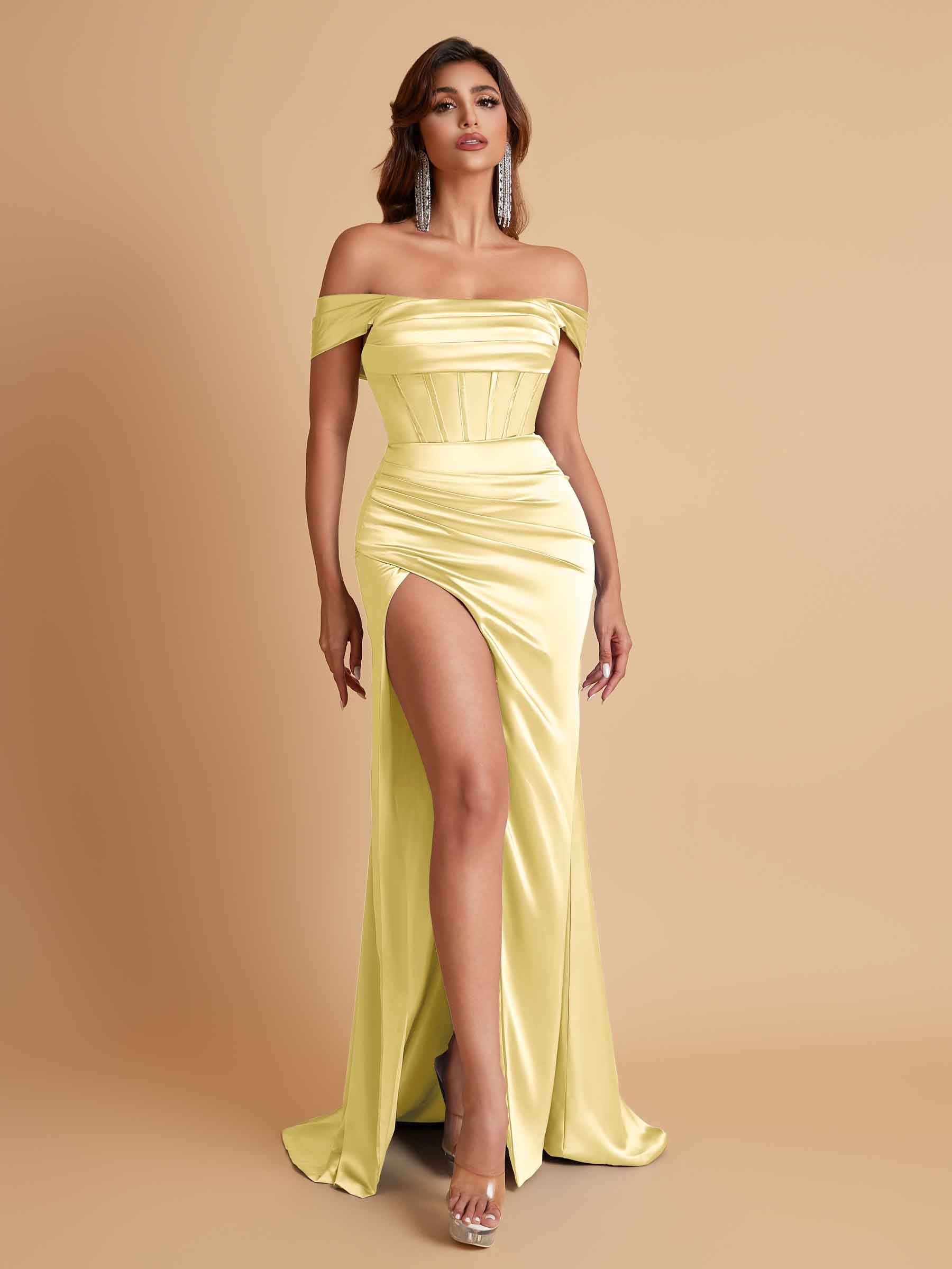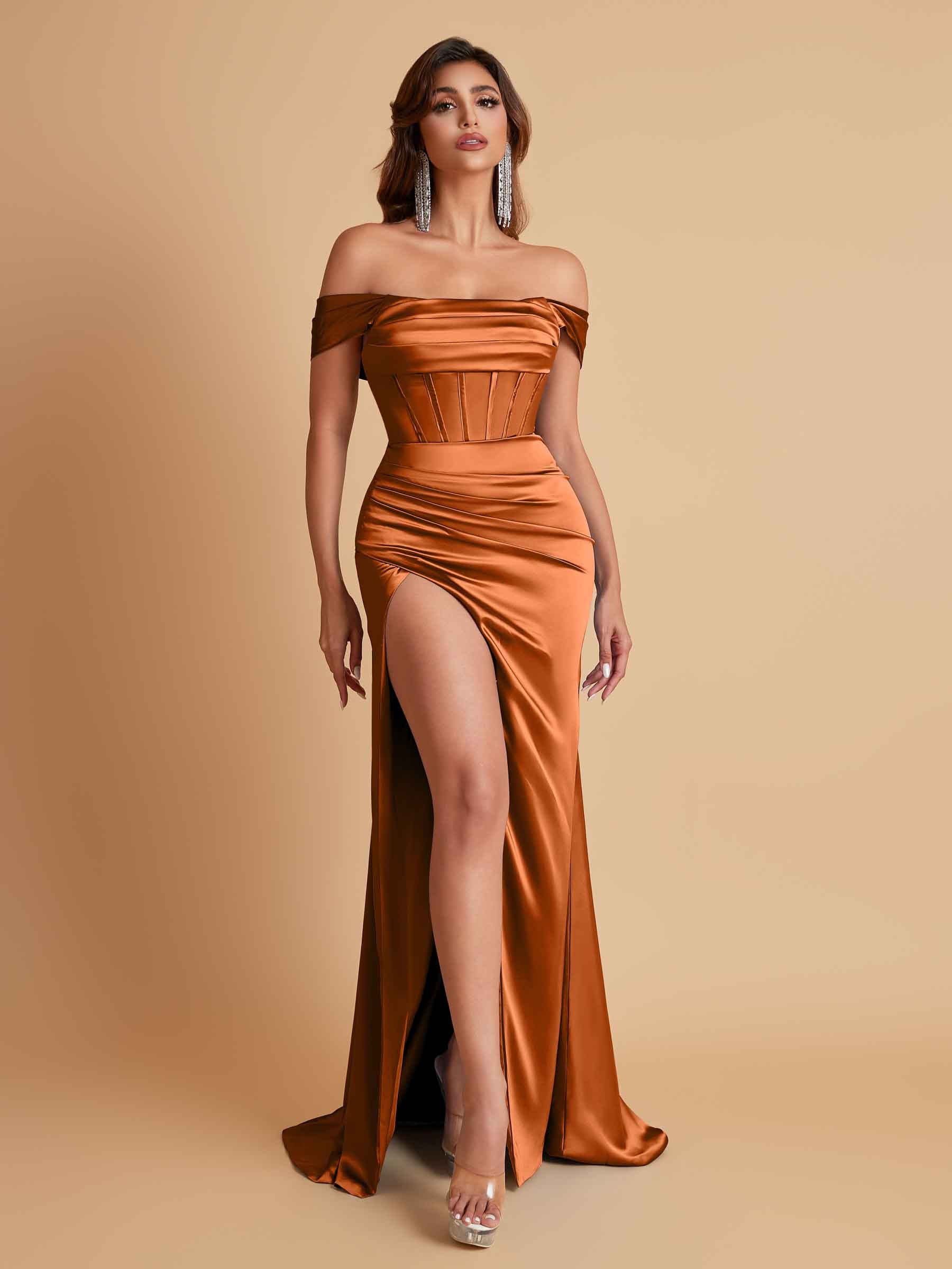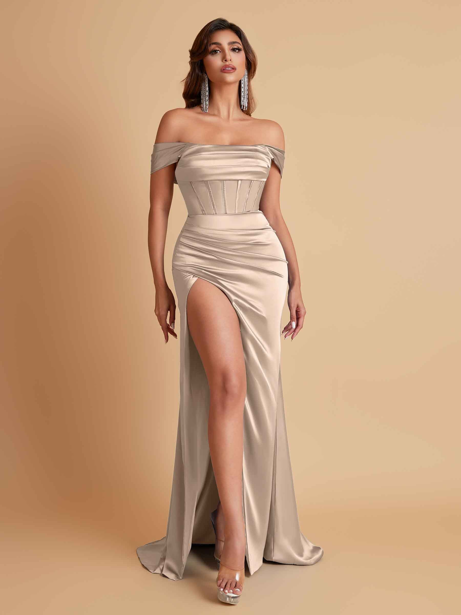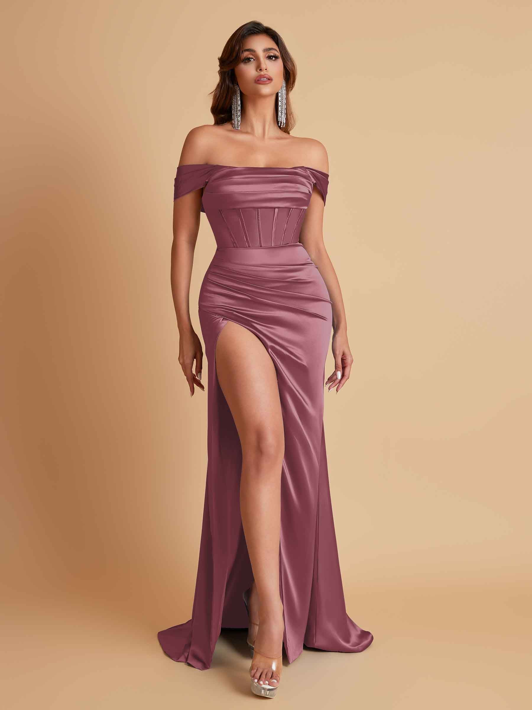 Sexy Off the Shoulder Soft Satin Side Slit Floor-Length Mermaid Bridesmaid Dresses