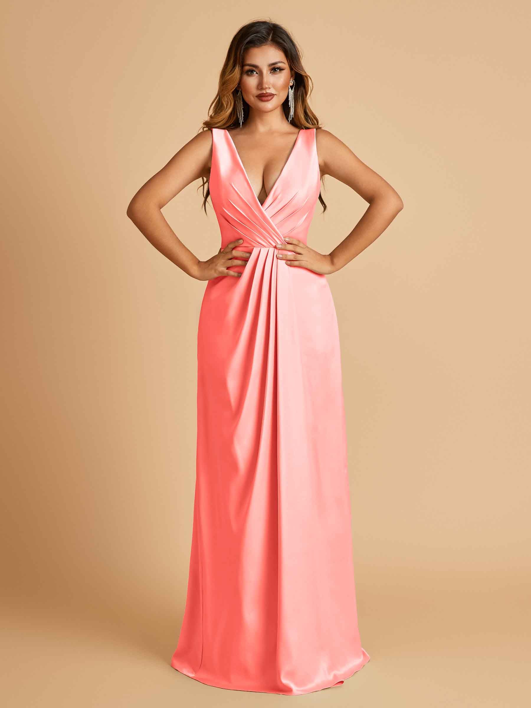 Sexy Satin Deep V-neck Long Bridesmaid Dresses A-line Pleats Sleeveless Floor Length