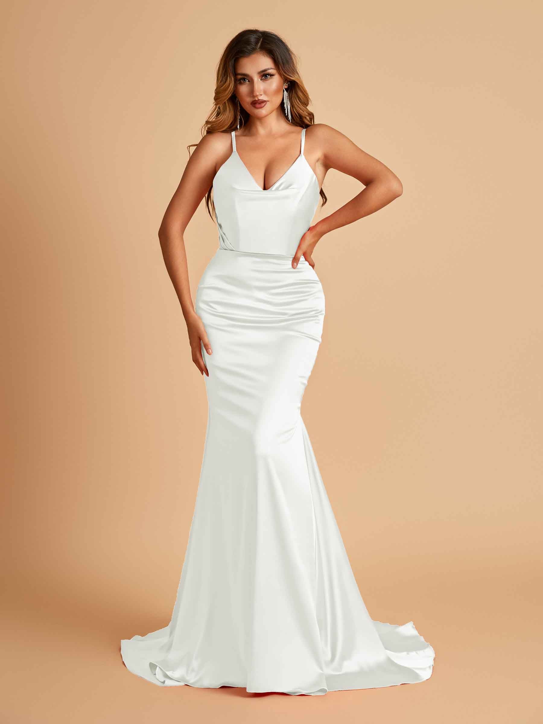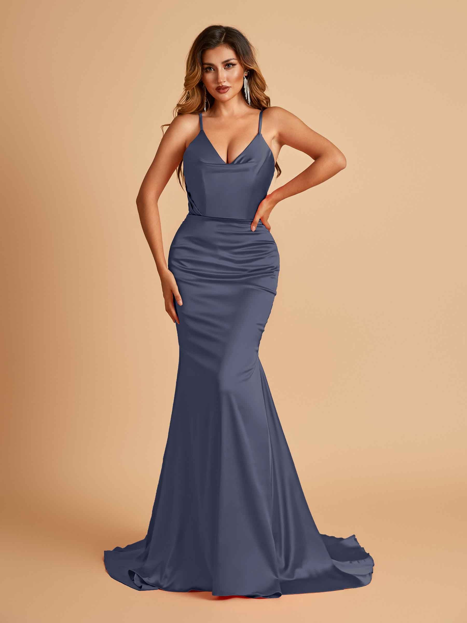 Sexy Satin Mermaid Prom Dresses Spaghetti Straps V-neck Pleats Floor Length