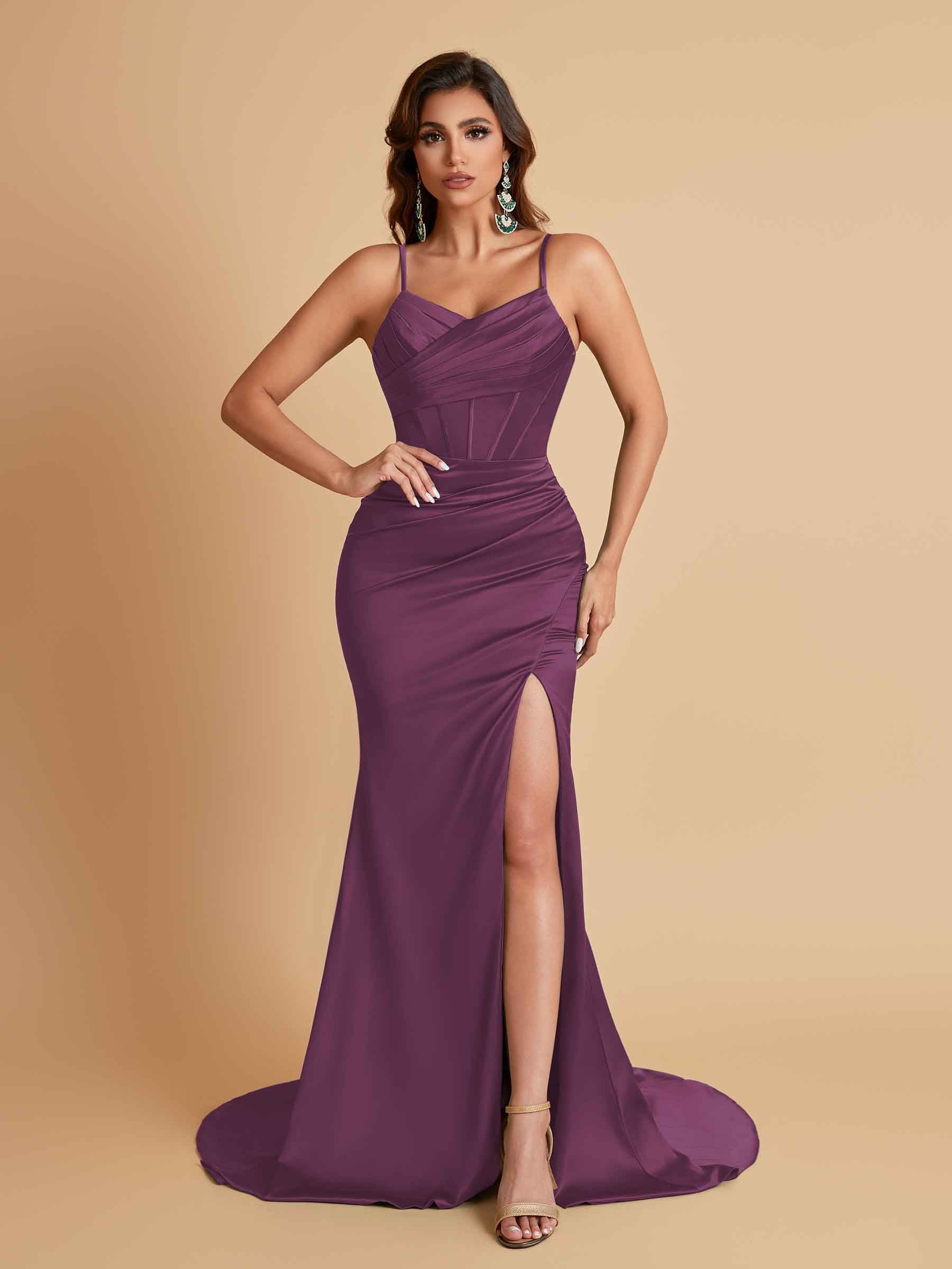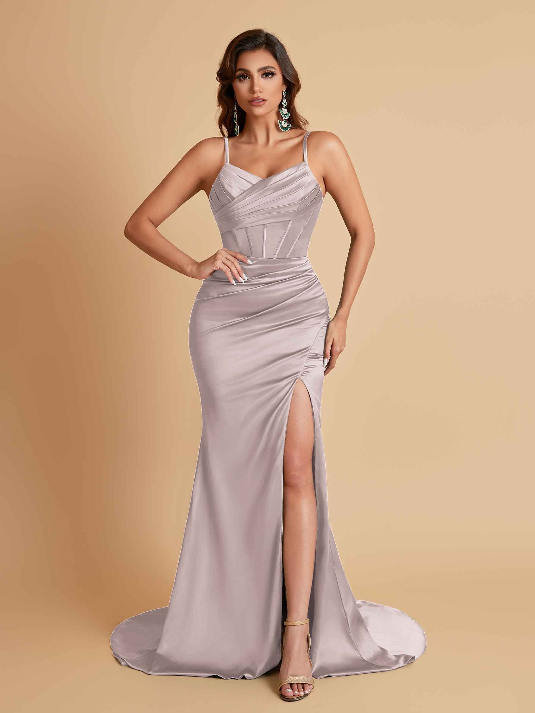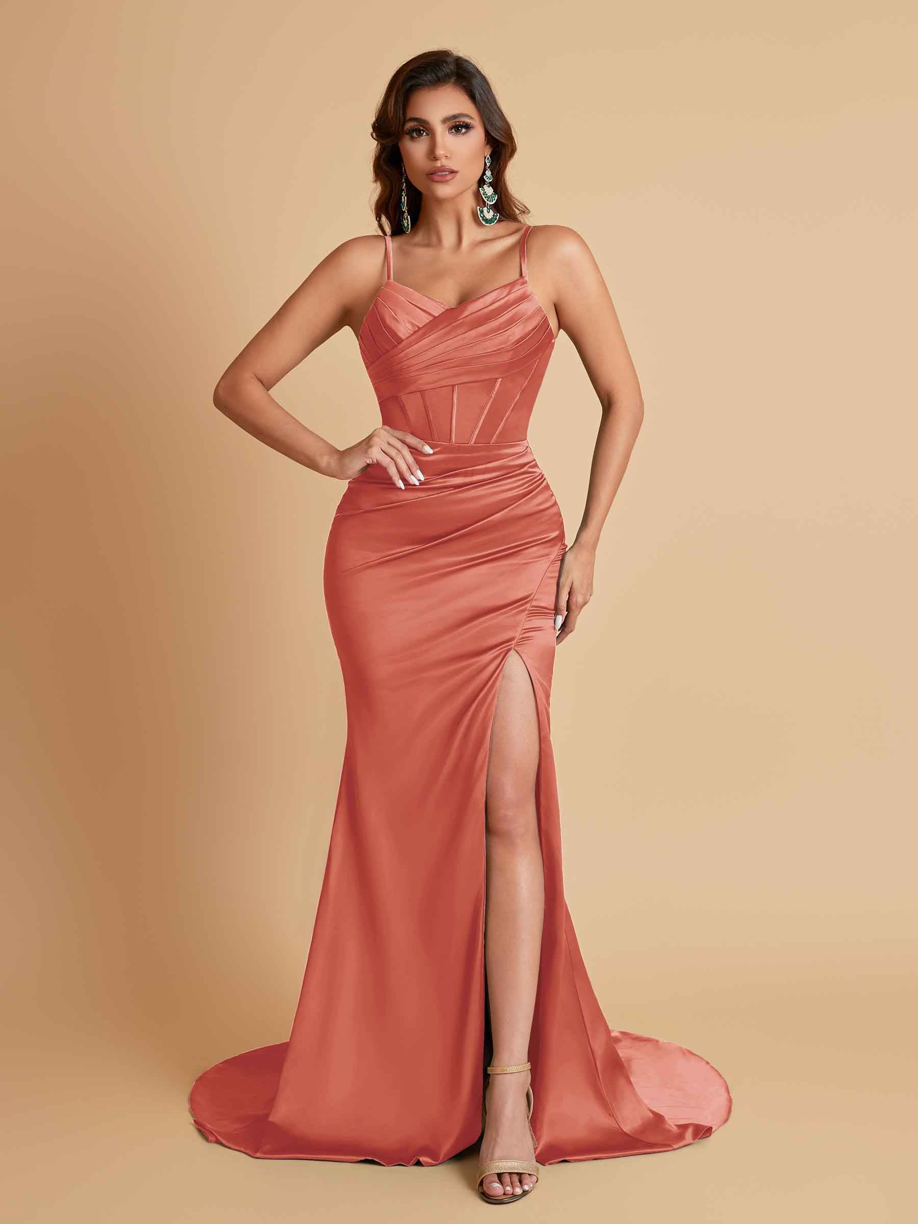 Sexy Spaghetti Straps V Neck Soft Satin Side Slit Floor-Length Mermaid Bridesmaid Dresses