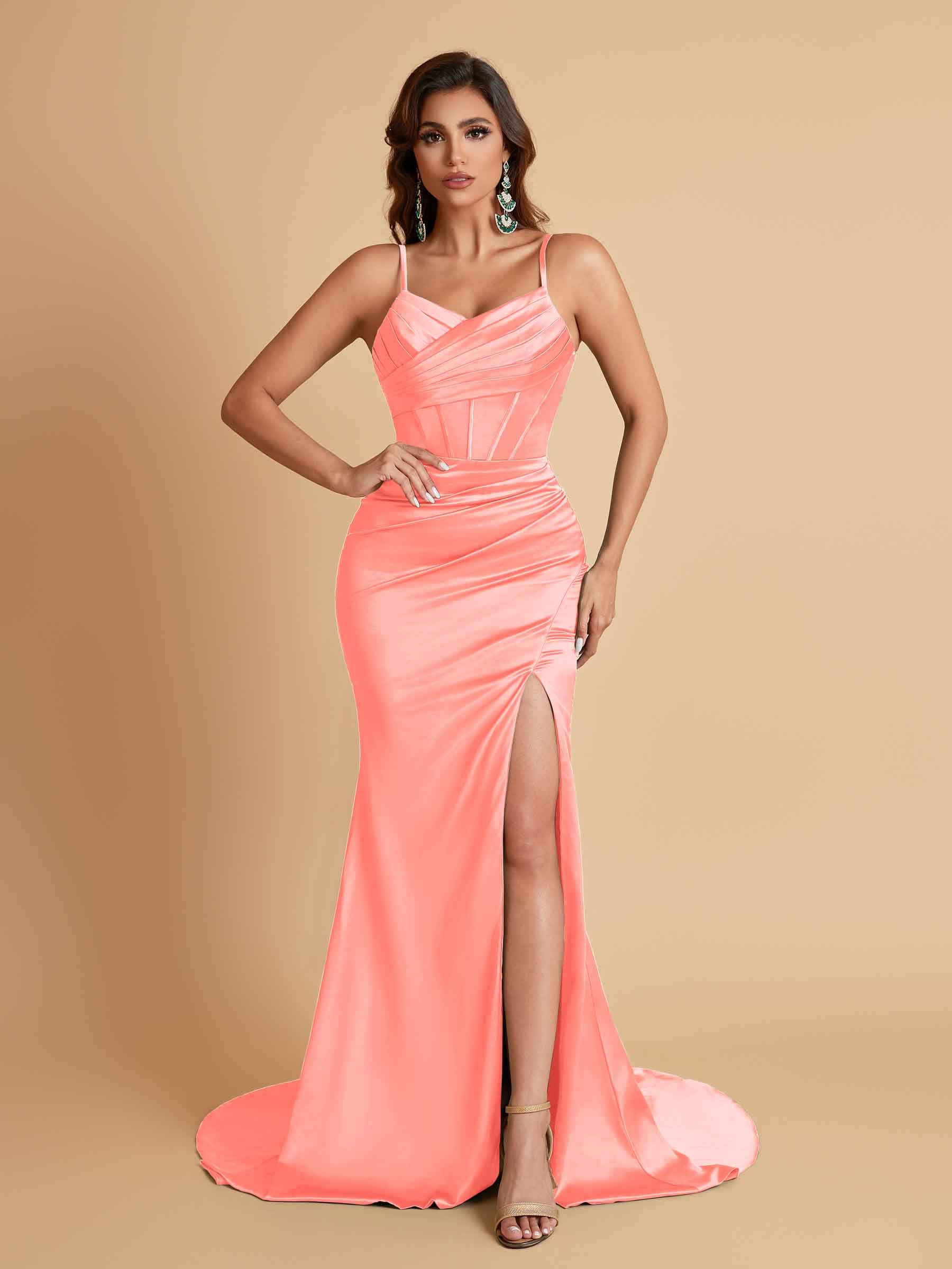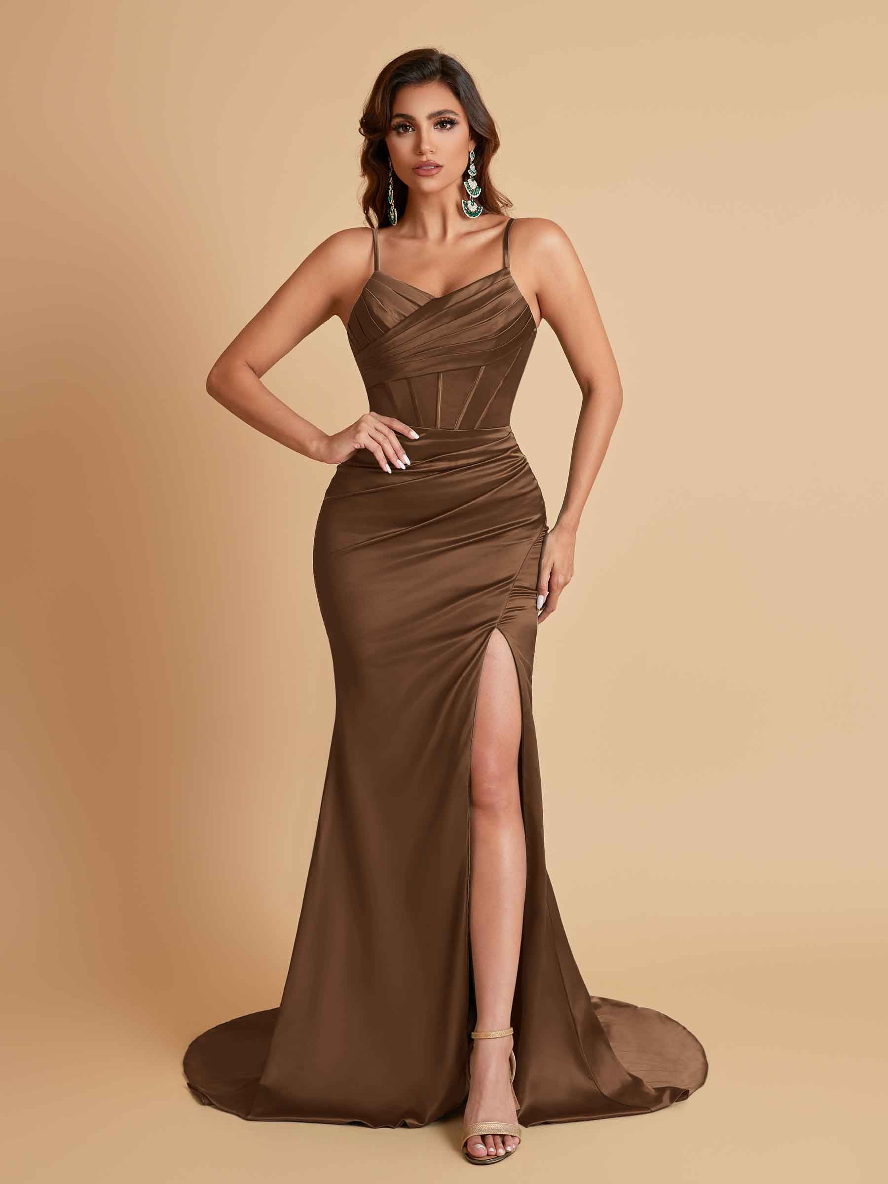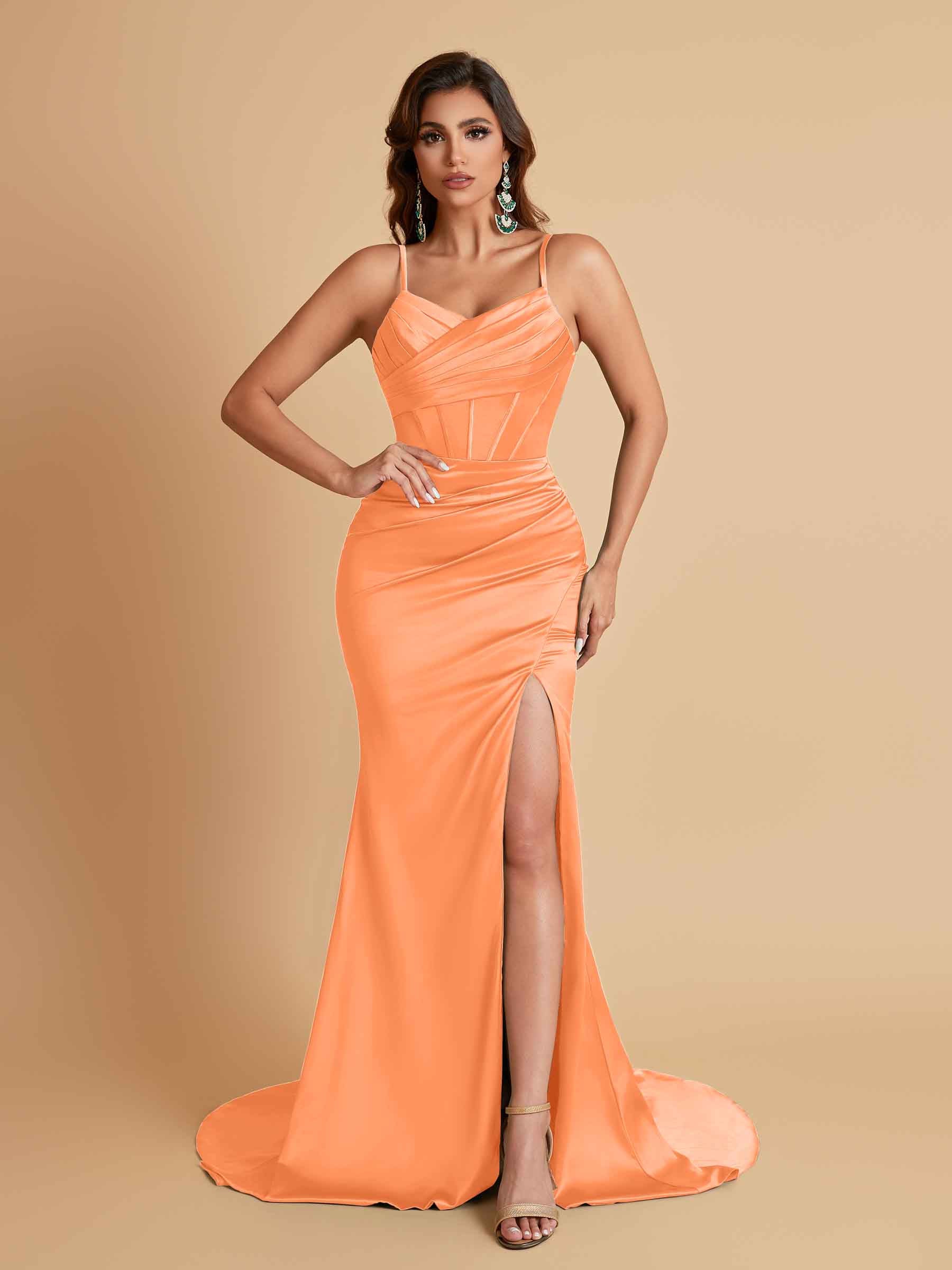 Sexy Spaghetti Straps V Neck Soft Satin Side Slit Floor-Length Mermaid Bridesmaid Dresses